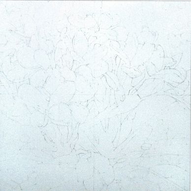 Because of the importance of the light in the painting, the first colour applied to the canvas is to the areas of "white lights" I paint the main flowers in the foreground first and I will progressively work my way to the background images and highlights at later stages. When painting with acrylic the strength of the colour needs to be a shade lighter than what Is required as acrylics often dry off in a darker shade.