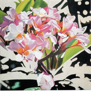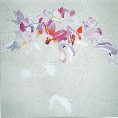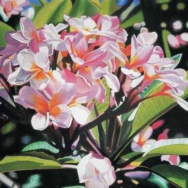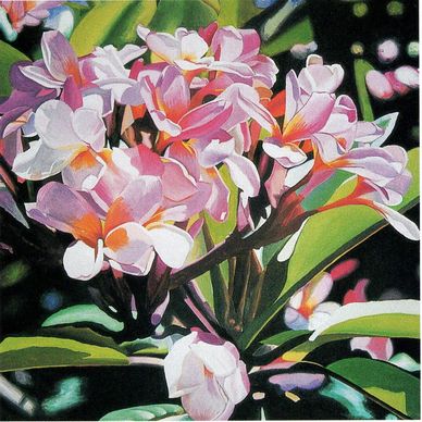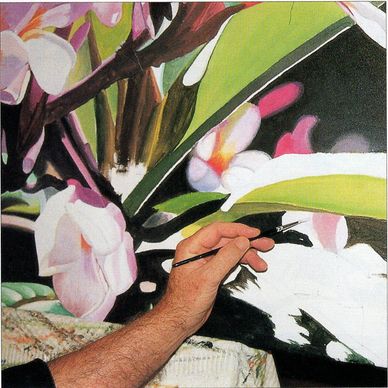 To help ensure that colour values of the main flowers are correct, now start blocking in the background and the "dark" shadows being cast upon the flower petals. This is a very important stage as the strength of colour, composition and contrast between the main subject and the background needs to be correct. At this point there may need to be some strengthening or dilution of colour. Because of the quick drying nature of acrylics, minor adjustments are relatively easy to make.